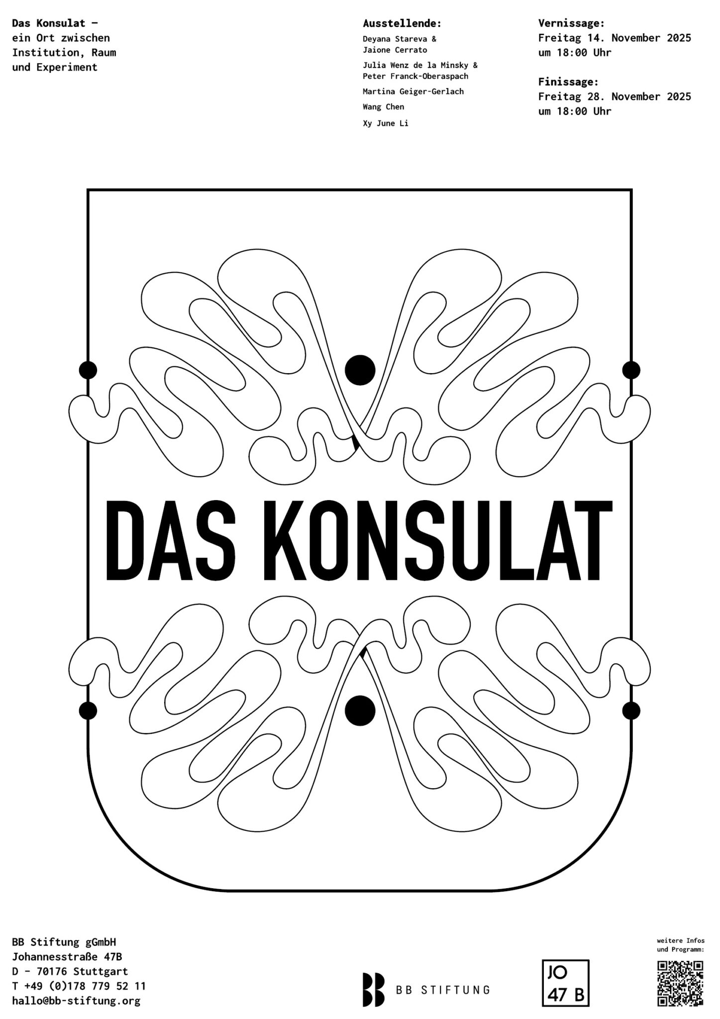 Nach unserem Open Call freuen wir uns, die Künstler:innen bekannt zu geben, die ab November im Rahmen von Das Konsulat in der Jo47B – dem Stiftungshaus der BB Stiftung – ihre Projekte präsentieren werden. Das Konsulat ist ein Ort zwischen Institution, Raum und Experiment – ein Labor für zeitgenössische künstlerische Praktiken, die neue Formen von Öffentlichkeit, Arbeit und ästhetischer Forschung erproben.